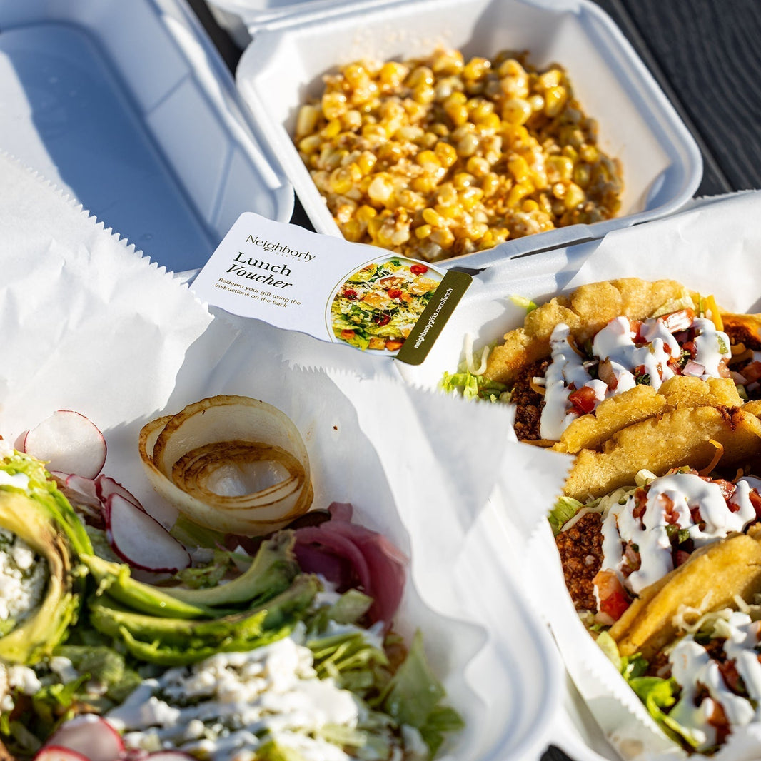 Treat your team to lunch, dinner, or coffee and pastry at their favorite participating local businesses with the Neighborly Gifts Restaurant Voucher.